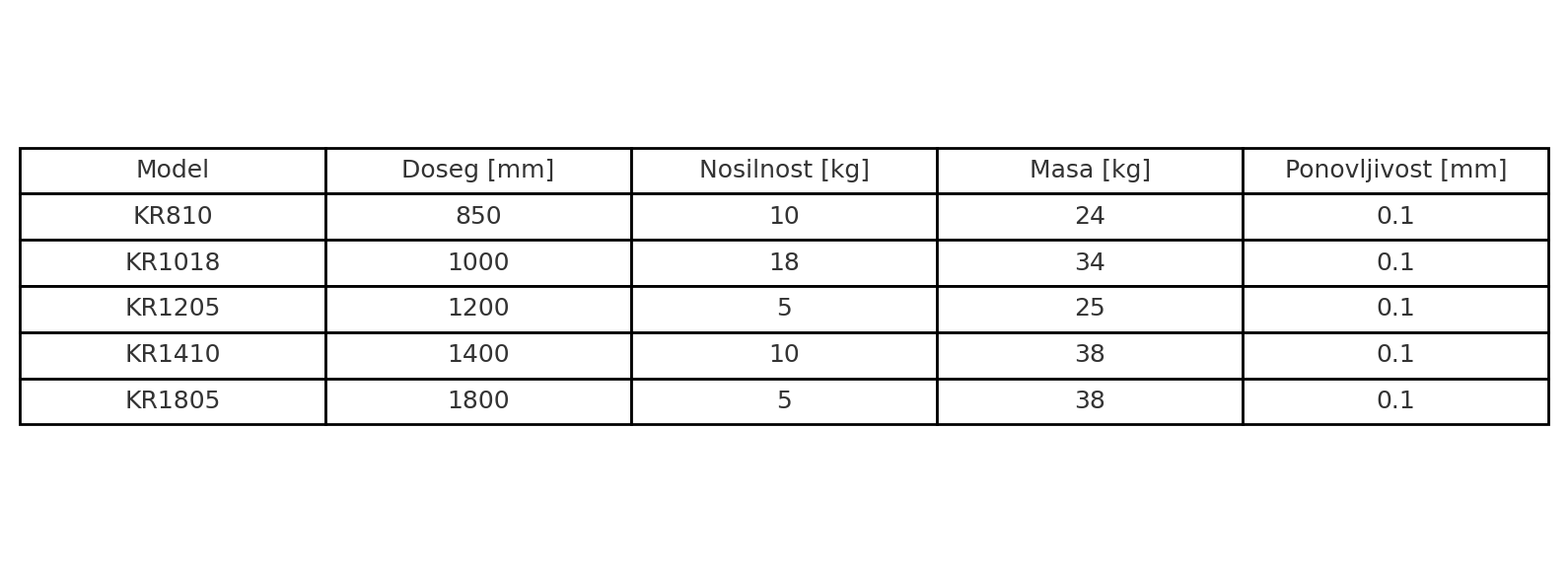 Ponovna natančnost (Repeatability): ±0,1 mm za vse modele, kar pomeni, da robot z večkrat ponovljivimi gibanji doseže zelo nizko varianco.